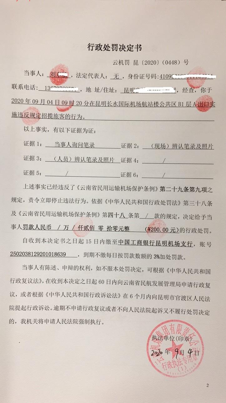 行政处罚决定书 云机罚 昆{2020} (0448)号
