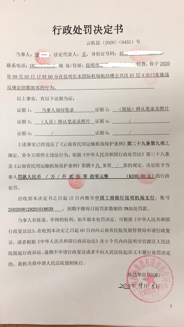 行政处罚决定书 云机罚 昆{2020} (0455)号