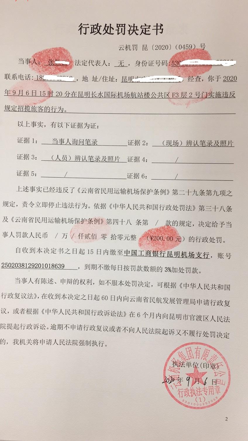 行政处罚决定书 云机罚 昆{2020} (0458)号
