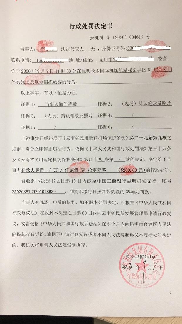 行政处罚决定书 云机罚 昆{2020} (0461)号