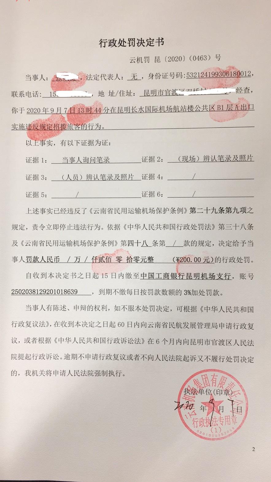 行政处罚决定书 云机罚 昆{2020} (0463)号