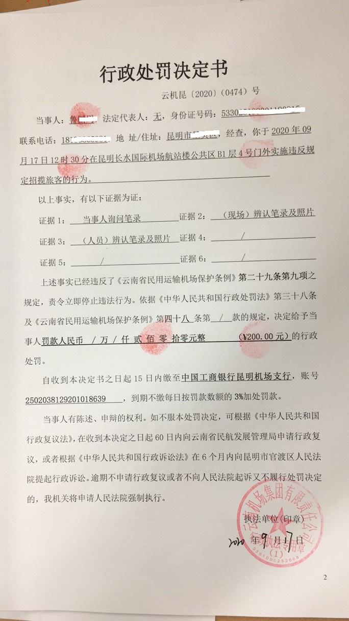 行政处罚决定书 云机罚 昆{2020} (0474)号