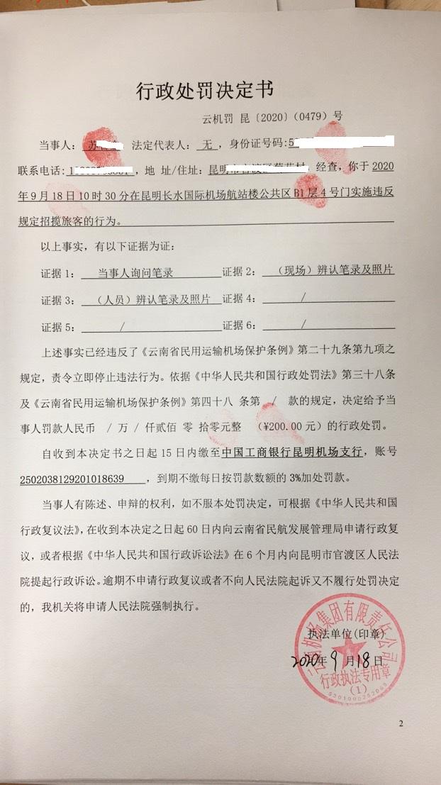 行政处罚决定书 云机罚 昆{2020} (0480)号