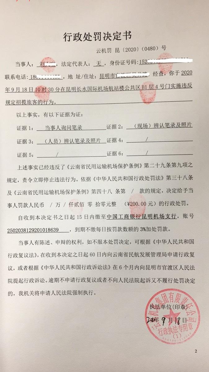 行政处罚决定书 云机罚 昆{2020} (0480)号