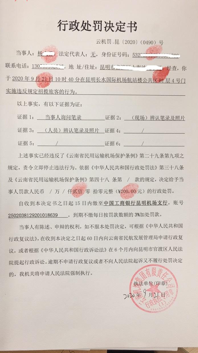 行政处罚决定书 云机罚 昆{2020} (0490)号