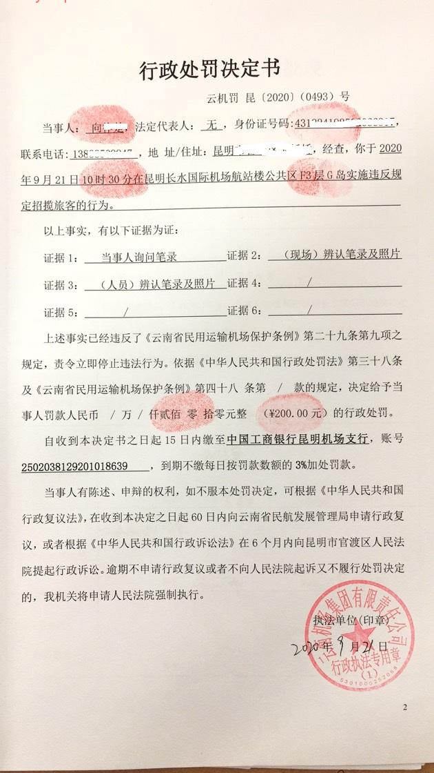 行政处罚决定书 云机罚 昆{2020} (0492)号