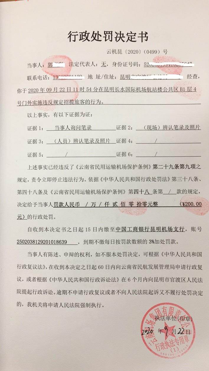 行政处罚决定书 云机罚 昆{2020} (0498)号
