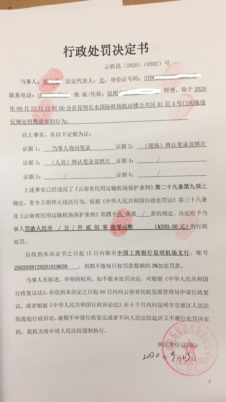 行政处罚决定书 云机罚 昆{2020} (0502)号