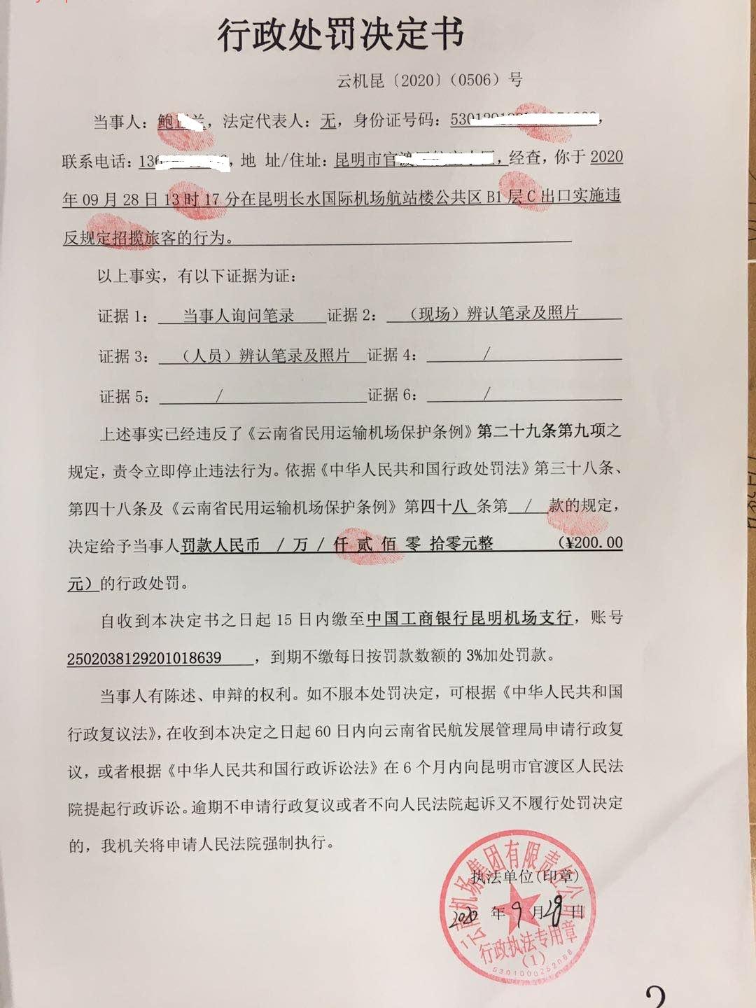 行政处罚决定书 云机罚 昆{2020} (0506)号