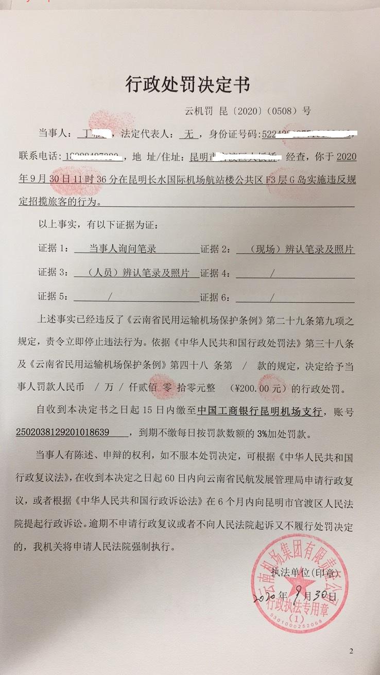 行政处罚决定书 云机罚 昆{2020} (0509)号