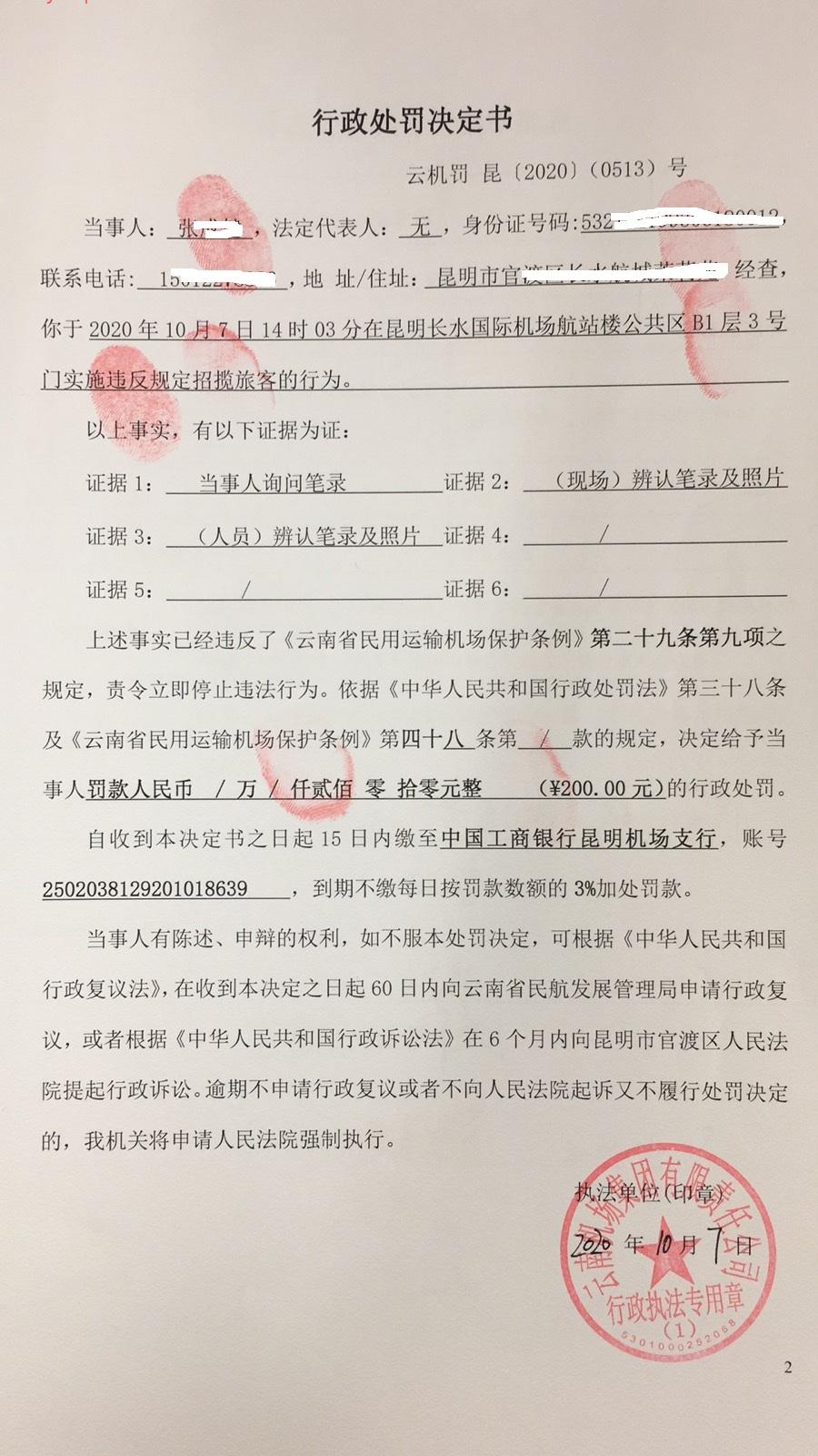 行政处罚决定书 云机罚 昆{2020} (0513)号