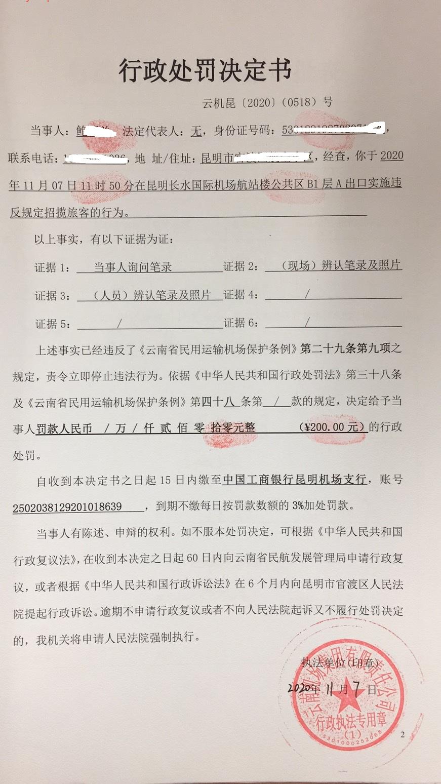 行政处罚决定书 云机罚 昆{2020} (0518)号