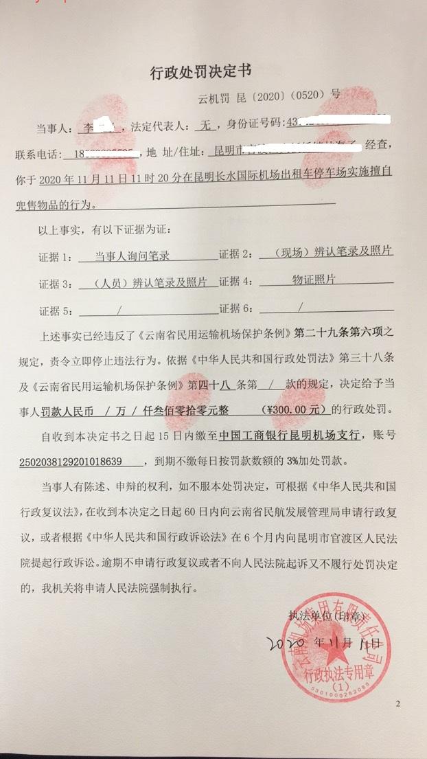 行政处罚决定书 云机罚 昆{2020} (0521)号