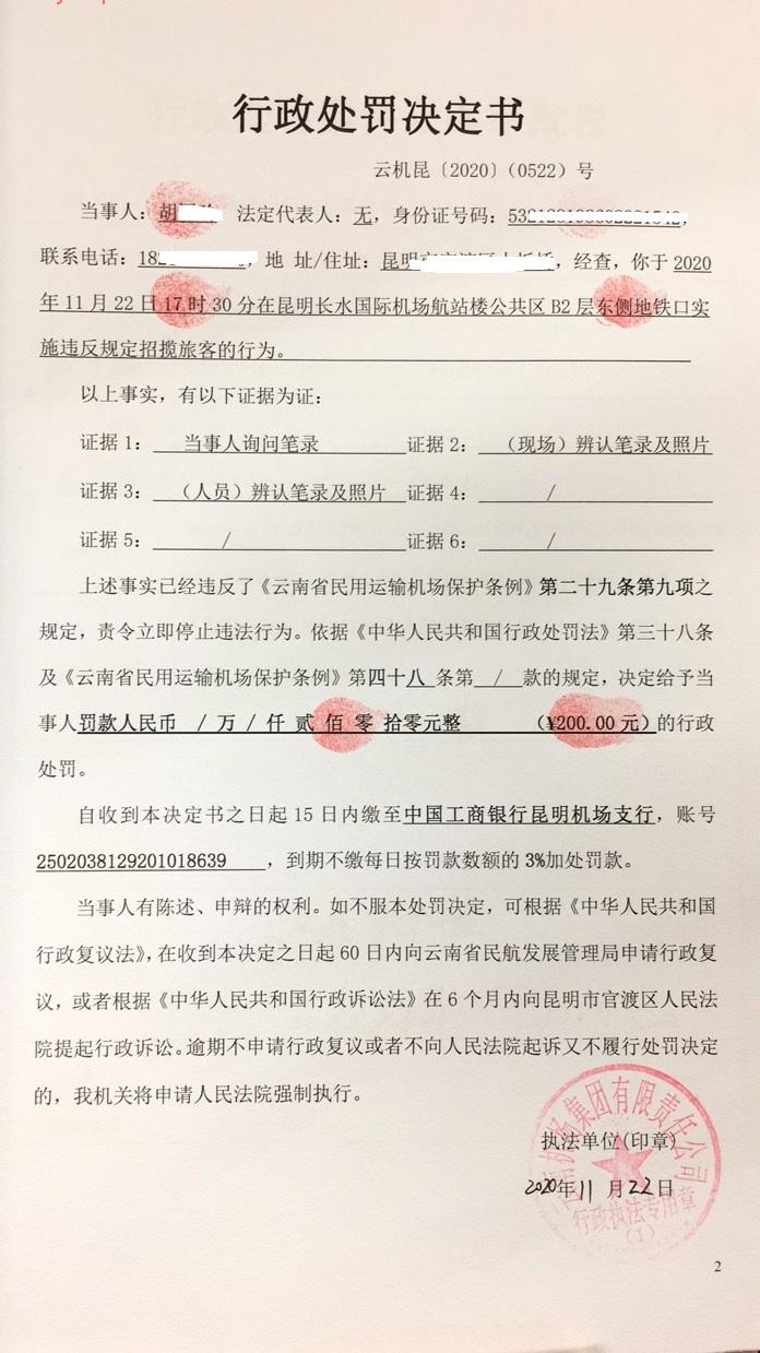 行政处罚决定书 云机罚 昆{2020} (0522)号