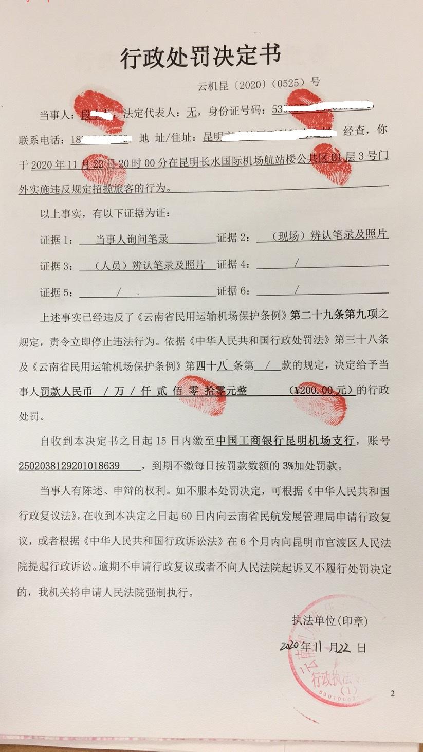 行政处罚决定书 云机罚 昆{2020} (0524)号