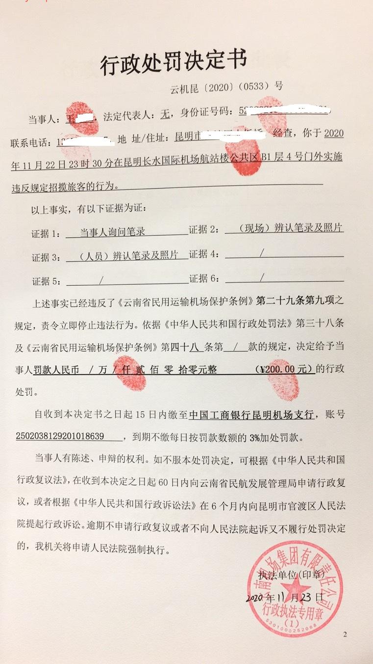 行政处罚决定书 云机罚 昆{2020} (0532)号