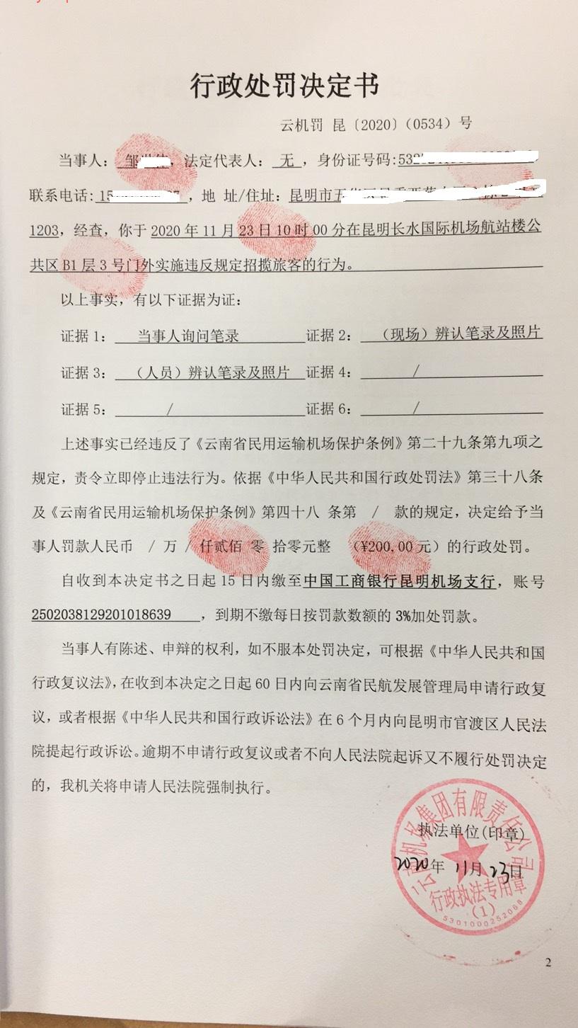 行政处罚决定书 云机罚 昆{2020} (0535)号