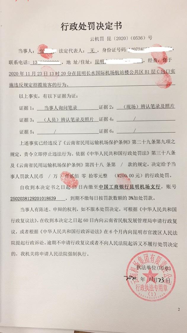行政处罚决定书 云机罚 昆{2020} (0536)号