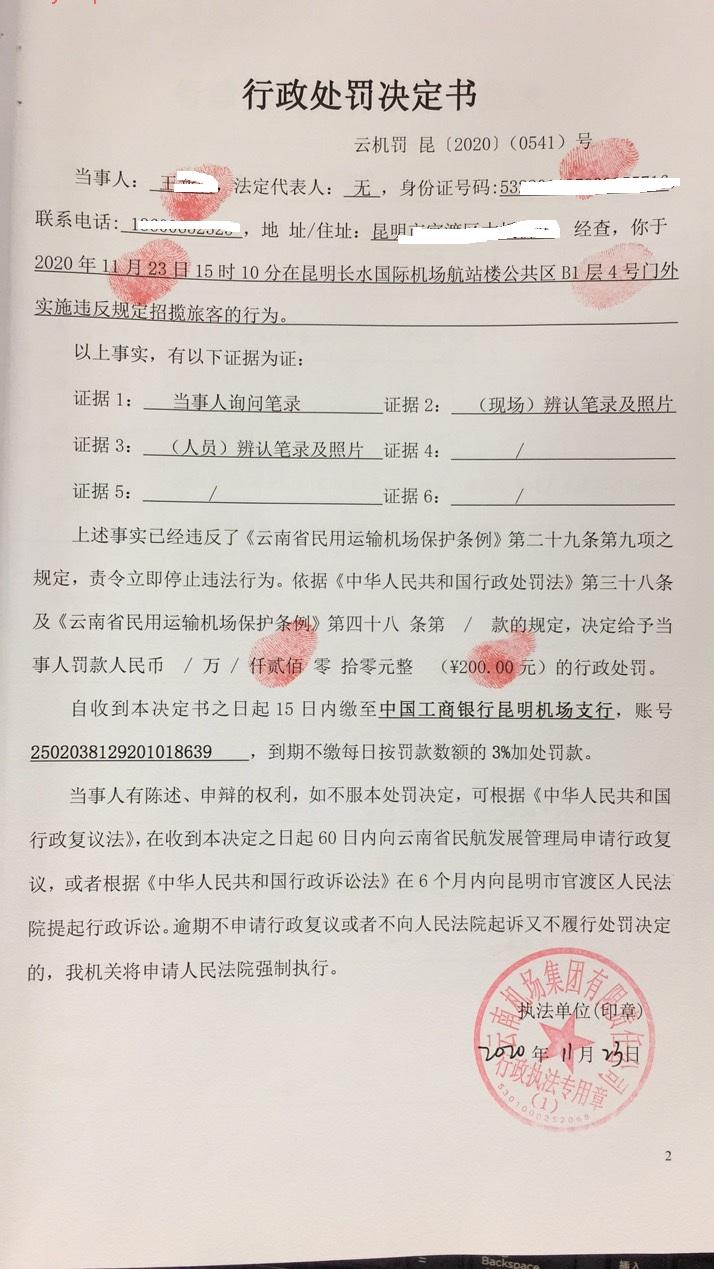 行政处罚决定书 云机罚 昆{2020} (0541)号