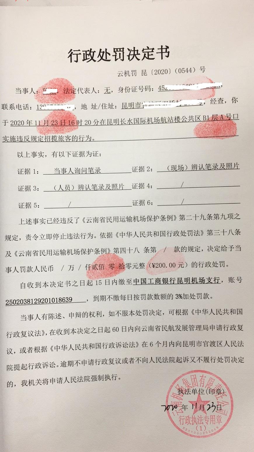 行政处罚决定书 云机罚 昆{2020} (0543)号