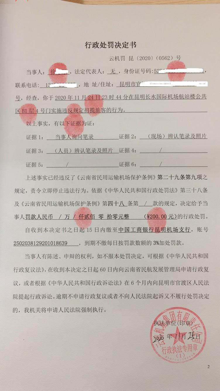 行政处罚决定书 云机罚 昆{2020} (0562)号