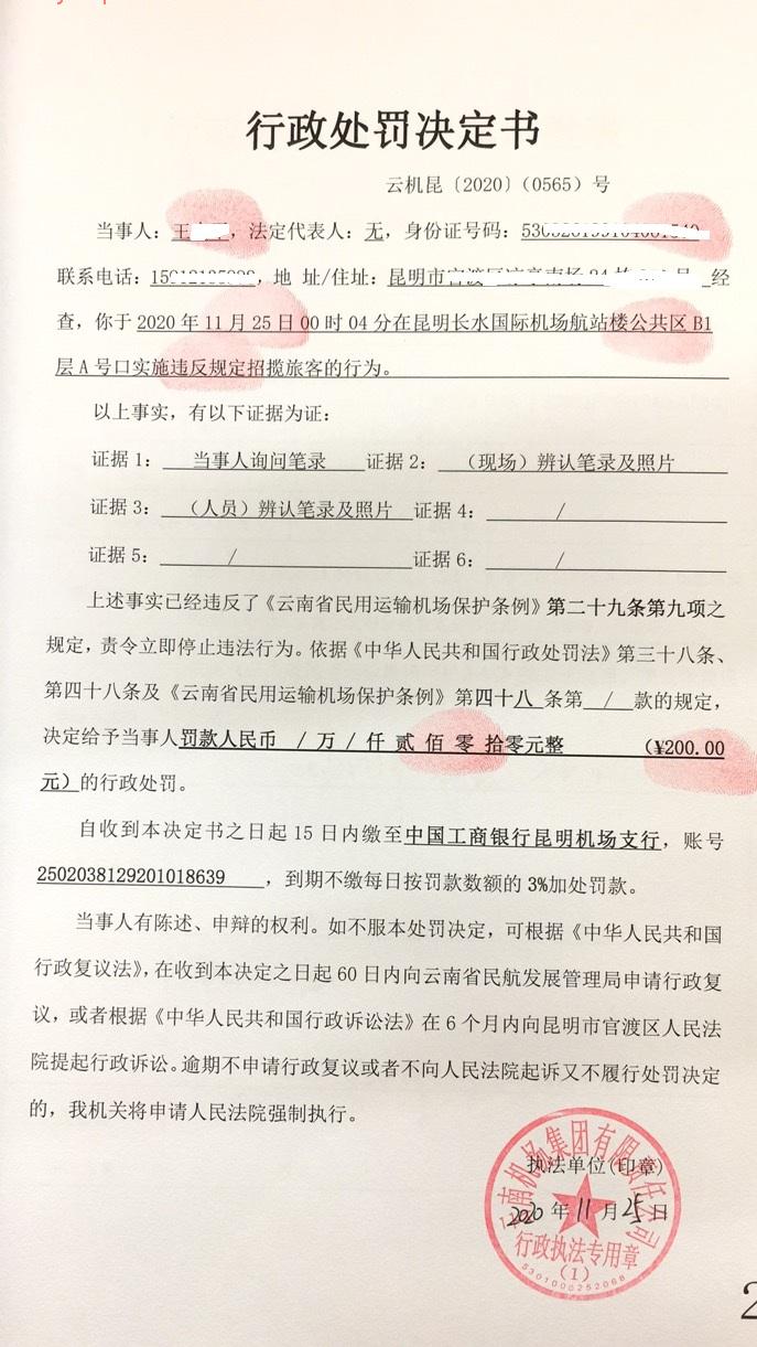 行政处罚决定书 云机罚 昆{2020} (0565)号