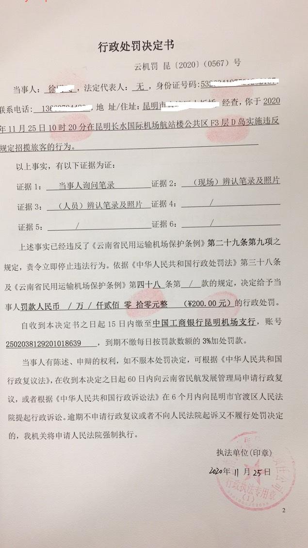 行政处罚决定书 云机罚 昆{2020} (0568)号