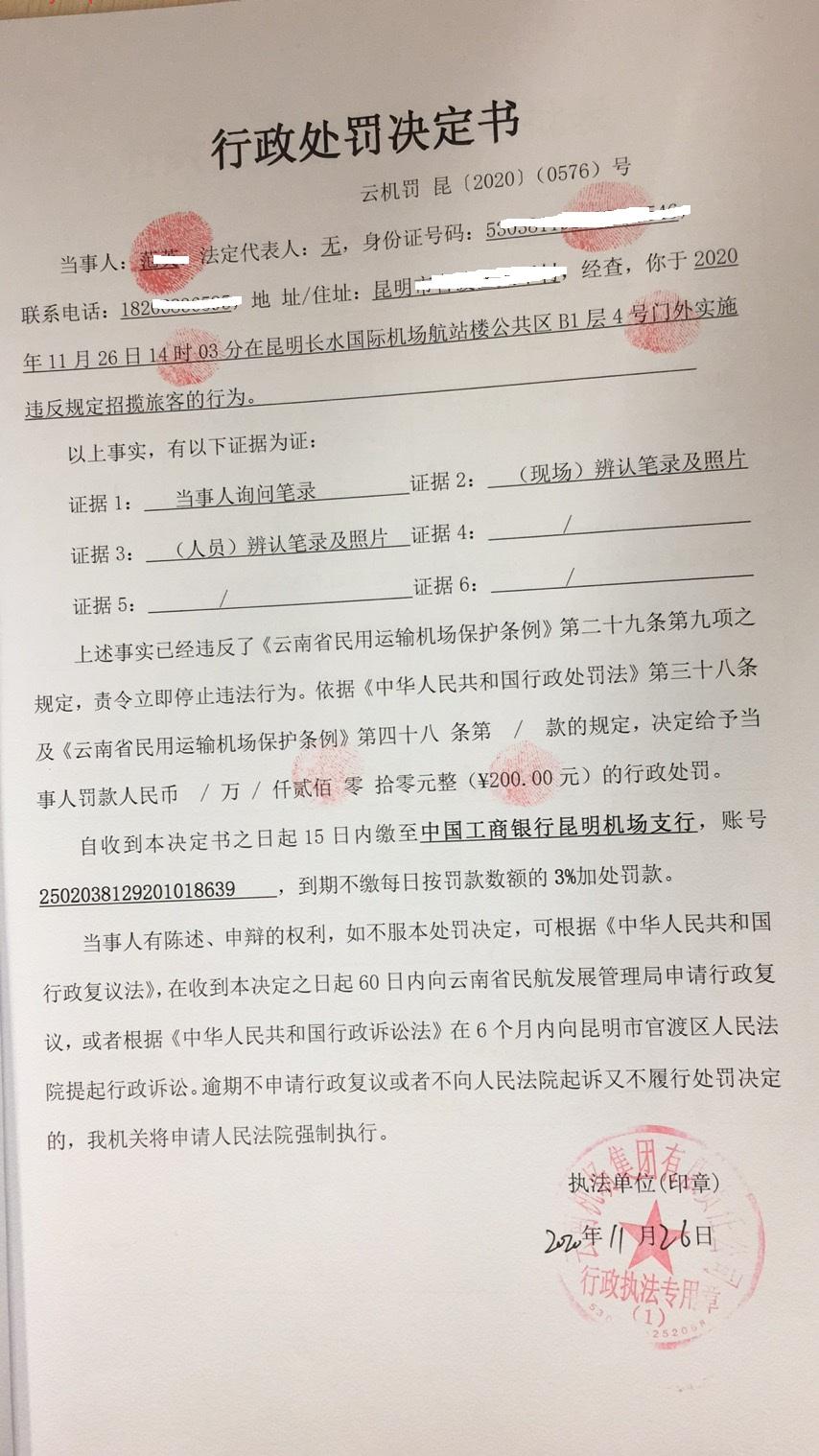 行政处罚决定书 云机罚 昆{2020} (0576)号
