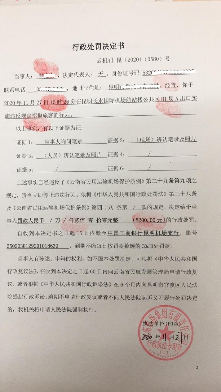行政处罚决定书 云机罚 昆{2020} (0579)号