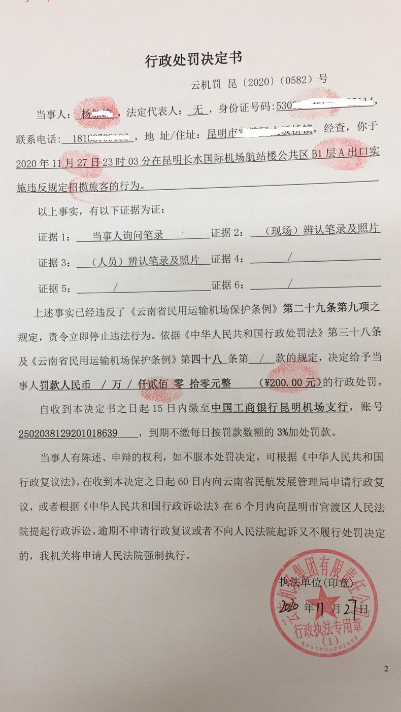 行政处罚决定书 云机罚 昆{2020} (0582)号