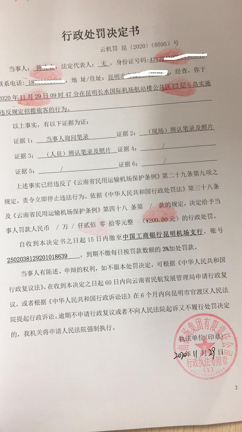 行政处罚决定书 云机罚 昆{2020} (0595)号