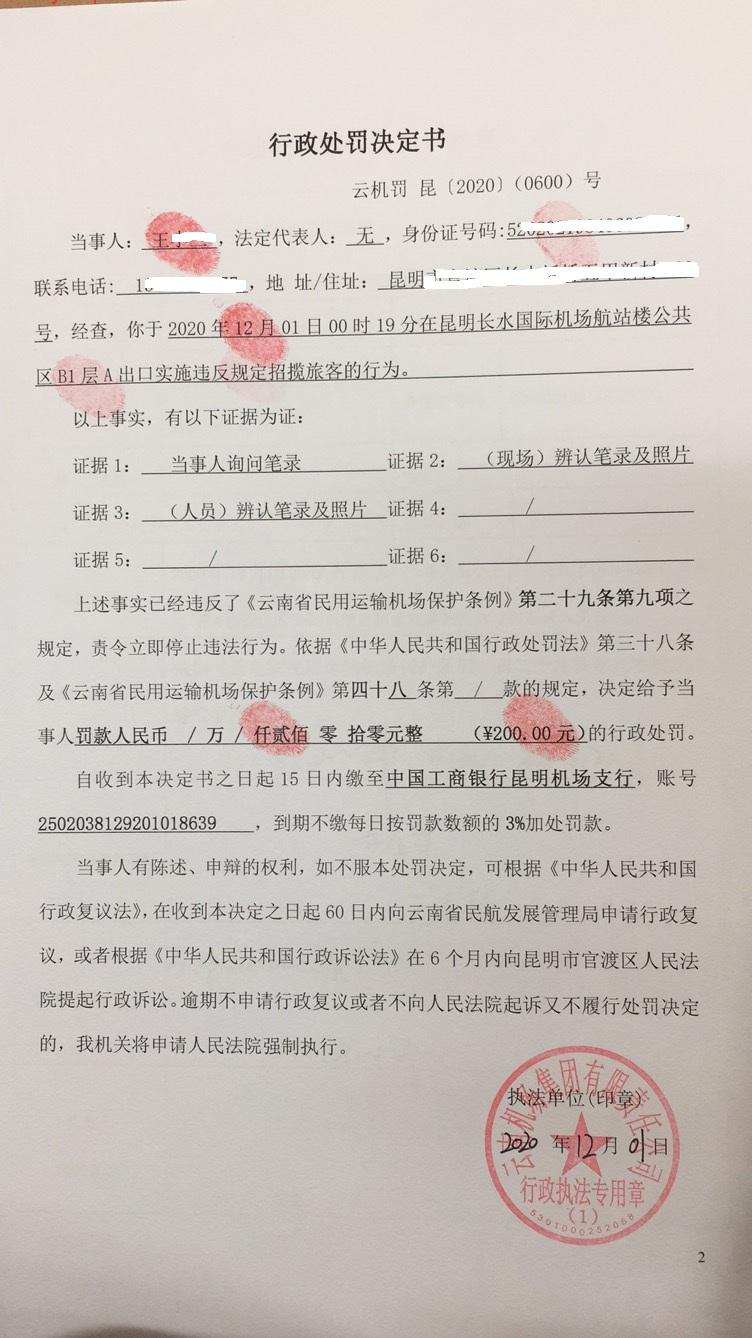 行政处罚决定书 云机罚 昆{2020} (0600)号