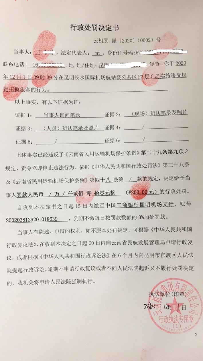 行政处罚决定书 云机罚 昆{2020} (0602)号