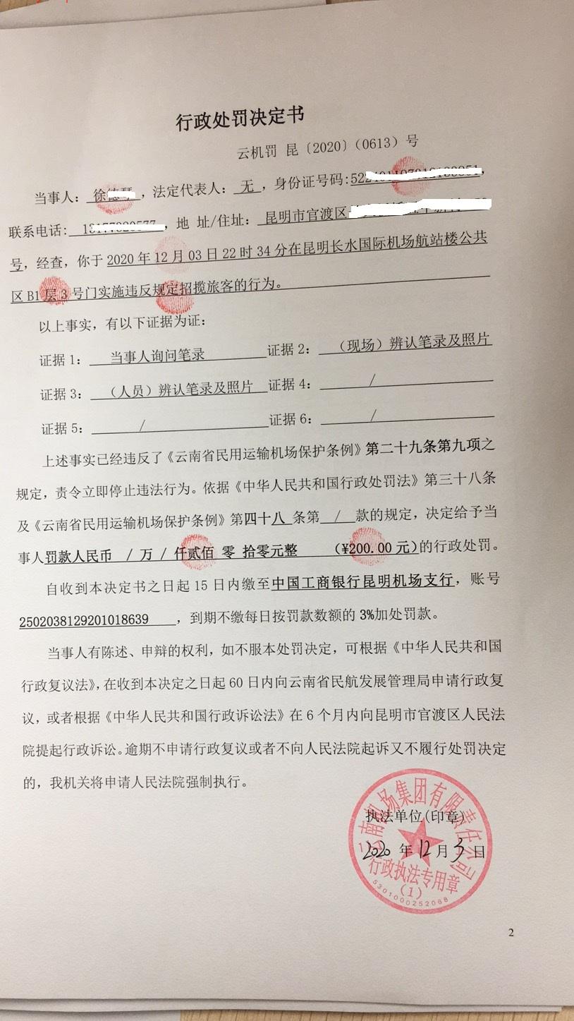 行政处罚决定书 云机罚 昆{2020} (0613)号