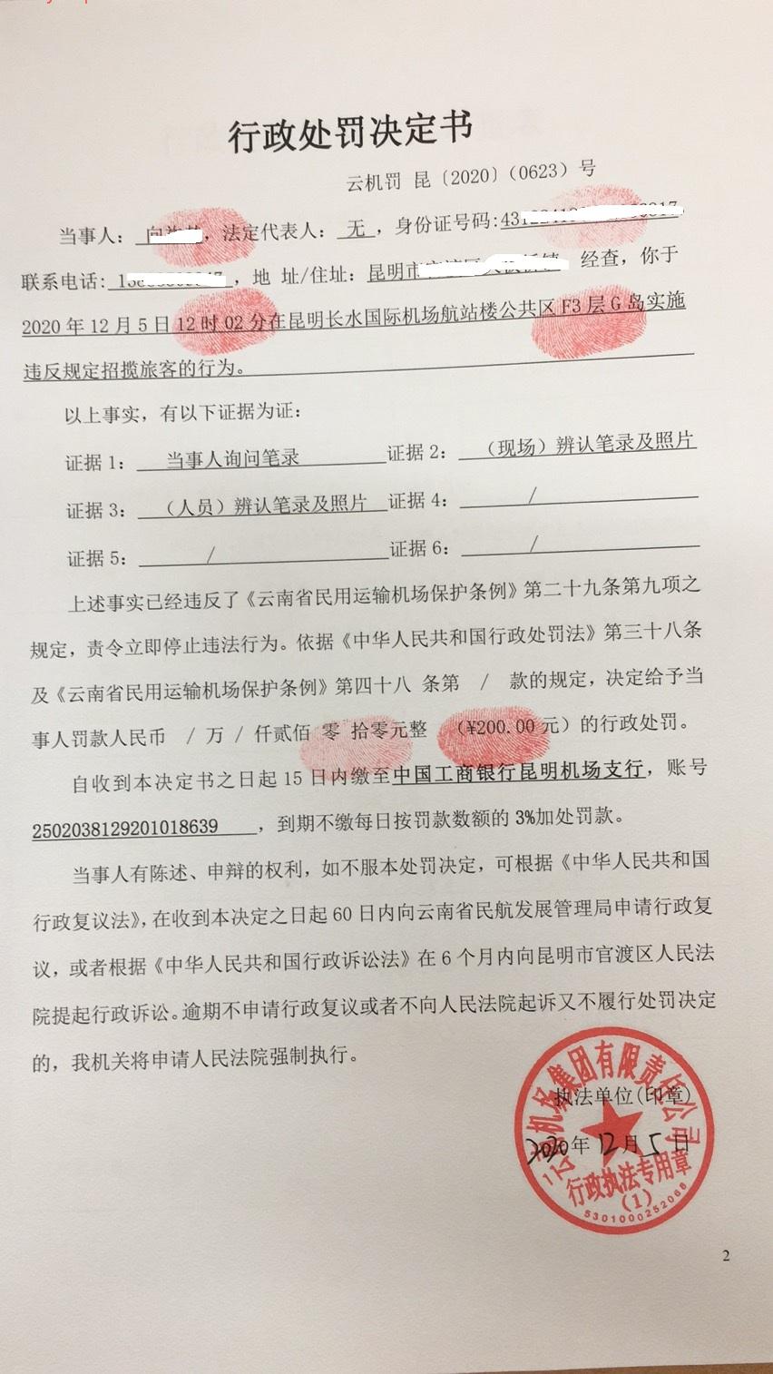 行政处罚决定书 云机罚 昆{2020} (0623)号