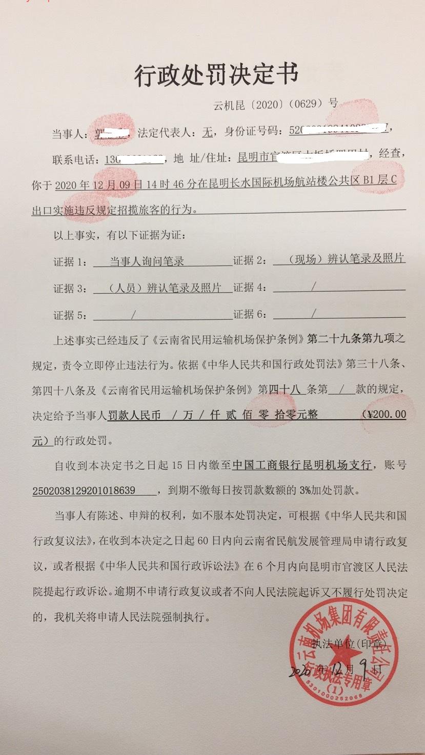 行政处罚决定书 云机罚 昆{2020} (0628)号