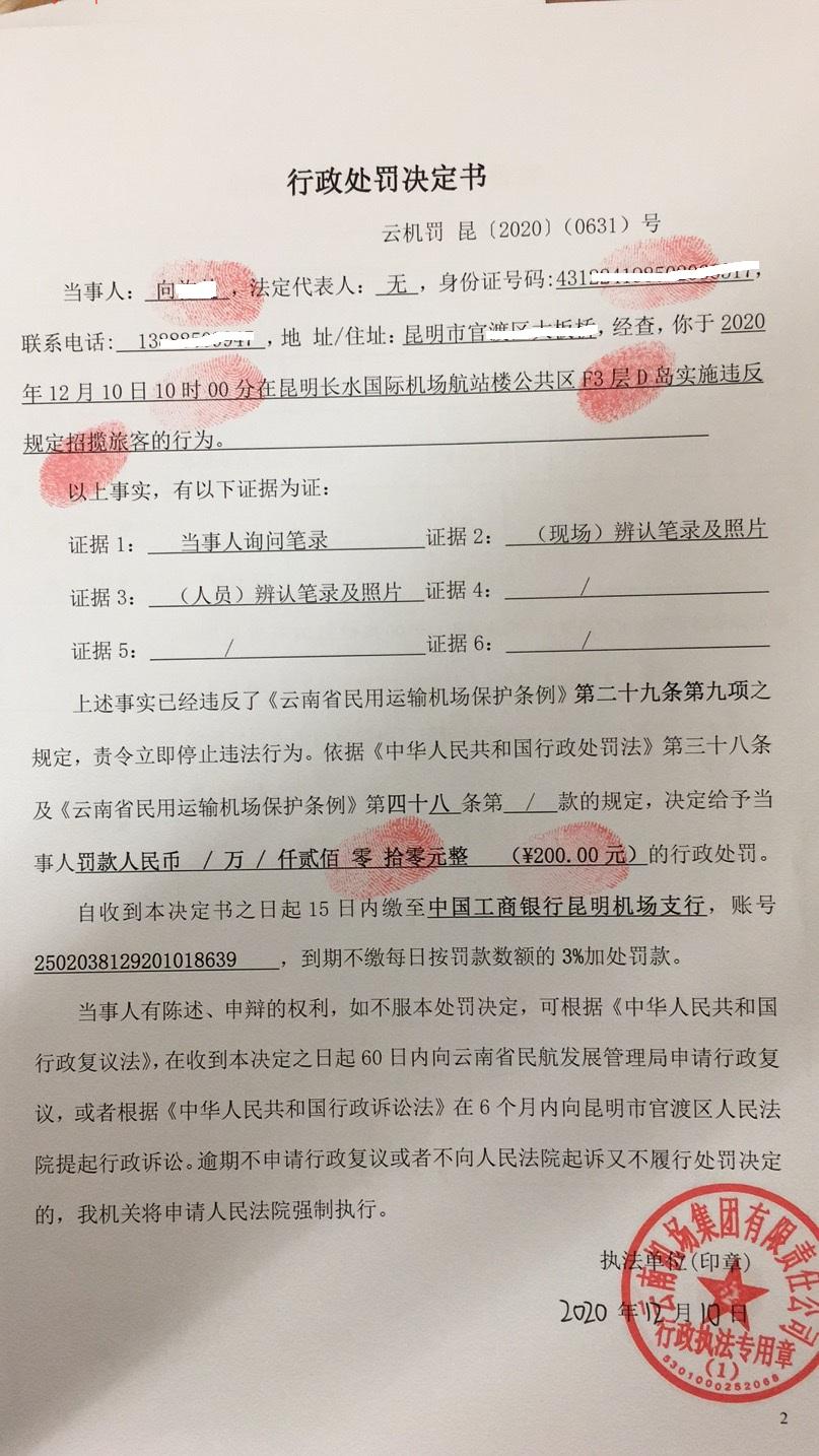 行政处罚决定书 云机罚 昆{2020} (0630)号