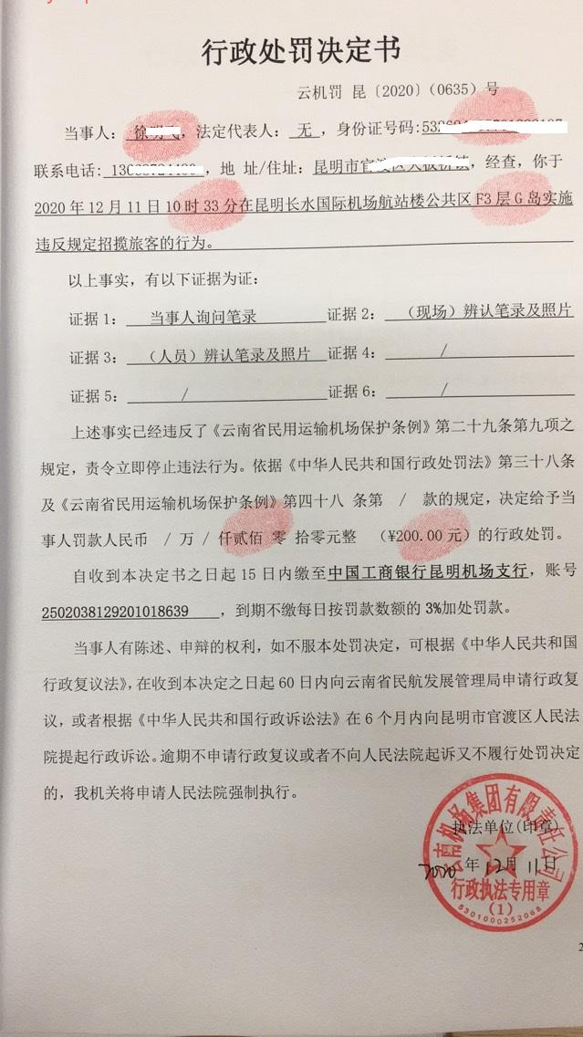 行政处罚决定书 云机罚 昆{2020} (0636)号