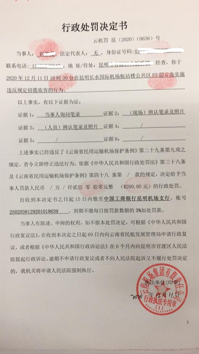行政处罚决定书 云机罚 昆{2020} (0636)号