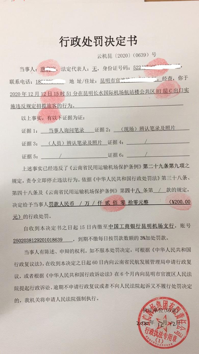 行政处罚决定书 云机罚 昆{2020} (0638)号