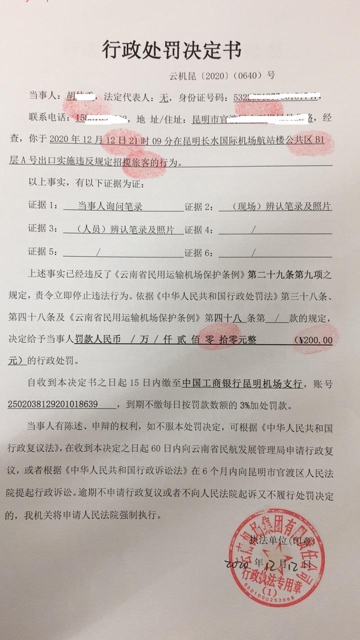 行政处罚决定书 云机罚 昆{2020} (0639)号