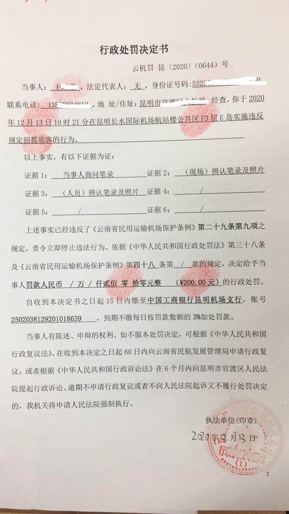 行政处罚决定书 云机罚 昆{2020} (0643)号