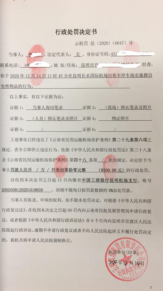 行政处罚决定书 云机罚 昆{2020} (0648)号