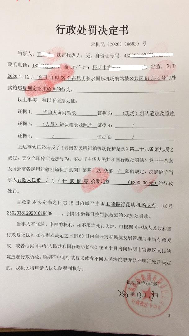 行政处罚决定书 云机罚 昆{2020} (0653)号