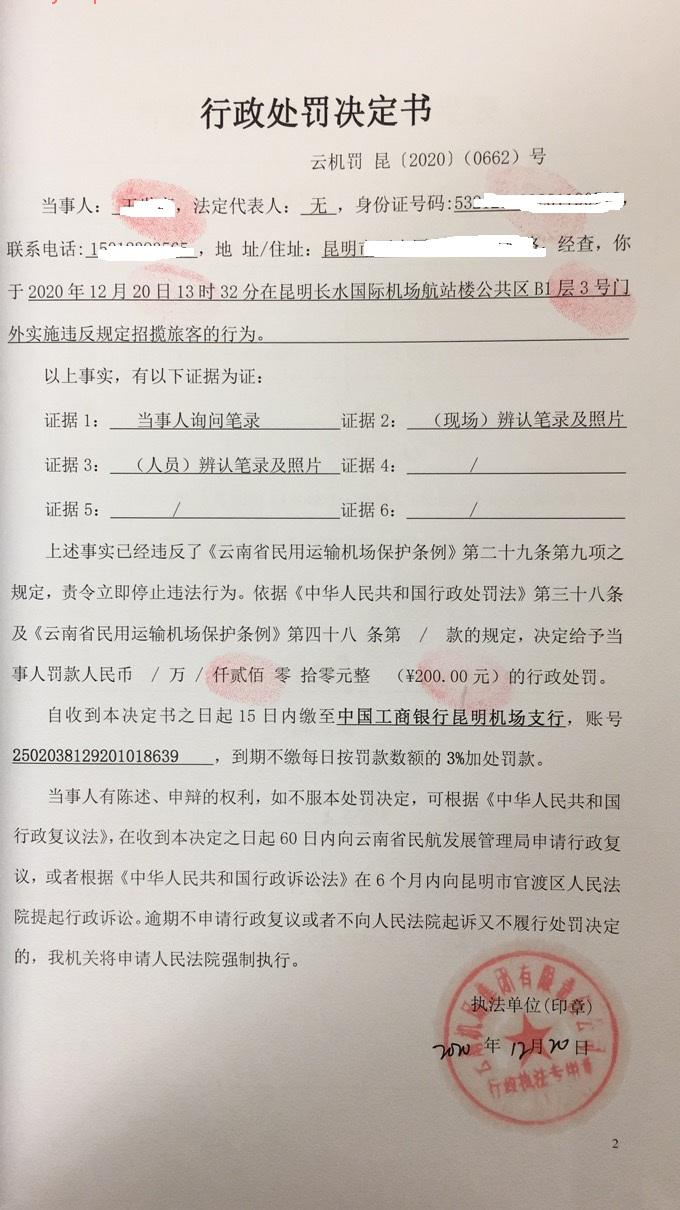行政处罚决定书 云机罚 昆{2020} (0662)号