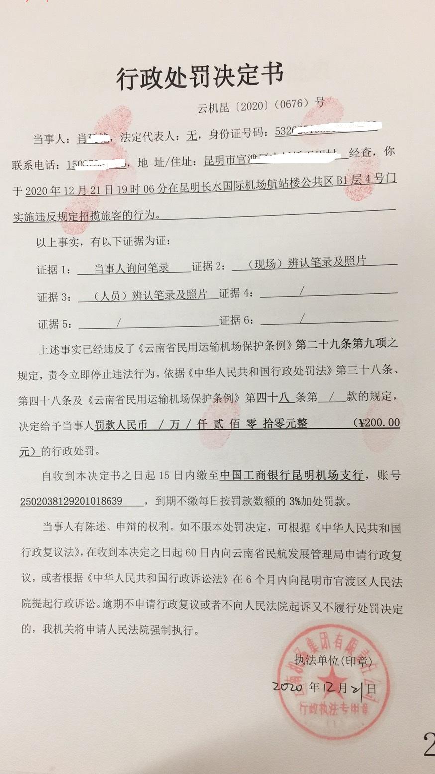 行政处罚决定书 云机罚 昆{2020} (0676)号