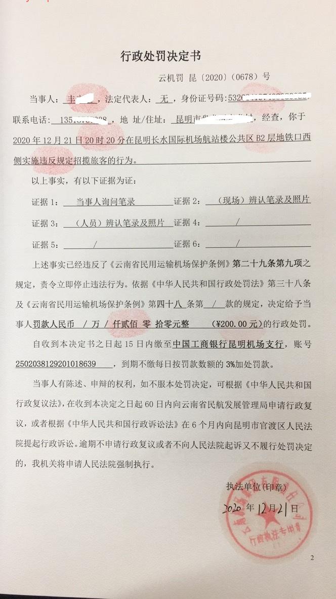 行政处罚决定书 云机罚 昆{2020} (0678)号