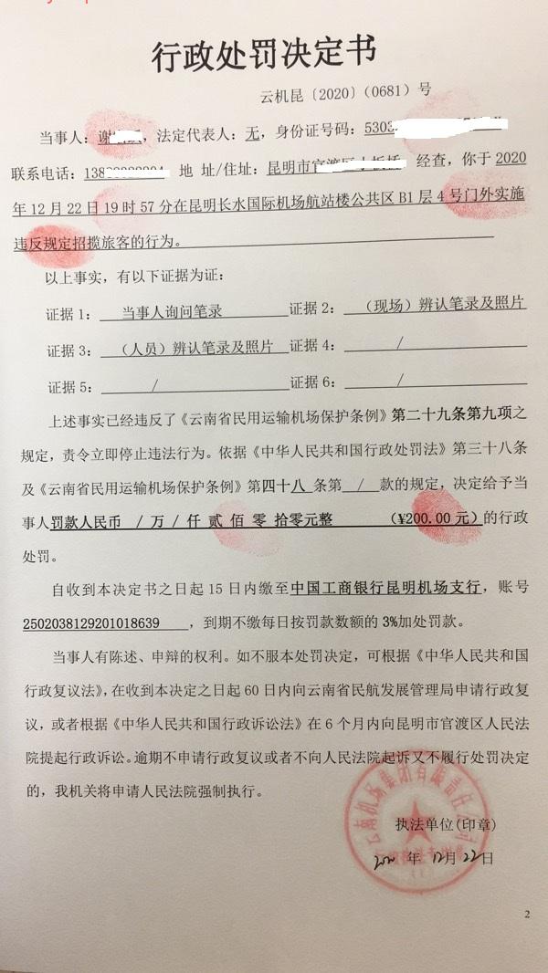 行政处罚决定书 云机罚 昆{2020} (0680)号