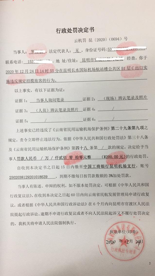 行政处罚决定书 云机罚 昆{2020} (0693)号