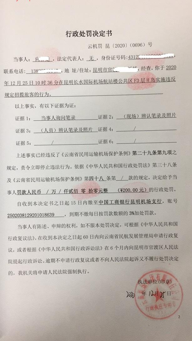 行政处罚决定书 云机罚 昆{2020} (0695)号